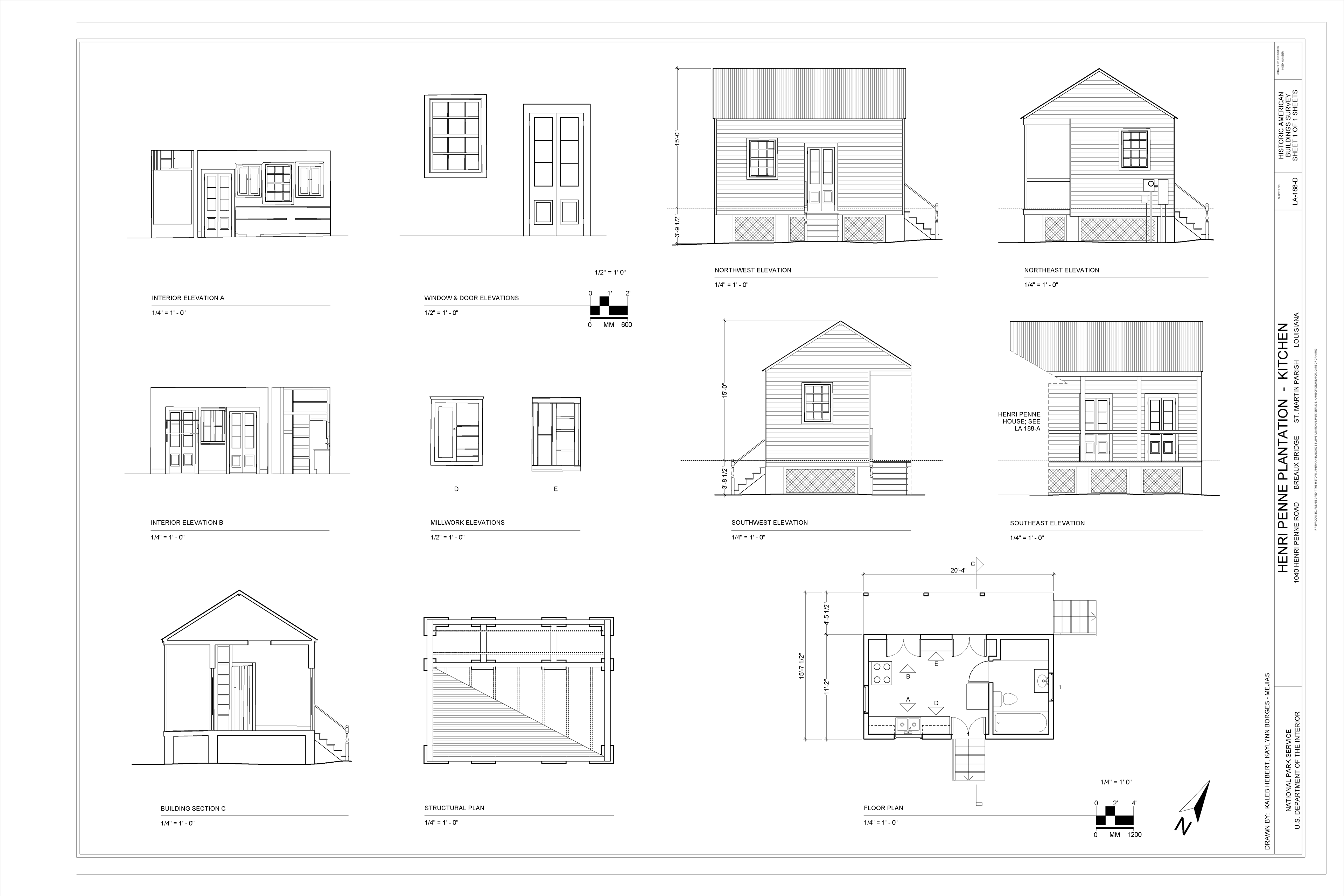 The Henri Penne property contains the following structures which were documented: Henri Penne house (LA-188-A), Fontanette-David Maison Dimanche (LA-188-B), Olivier Pigeonniere (LA-188-C), Kitchen (LA-188-D), Outhouse (LA-188-E), and Tool Shed (LA-188-F). Each of the structures documented are historically significant but are not original to their current site. Each structure was in danger of demolition and/or deterioration at its original location. The buildings were each relocated from separate sites and placed to form a plantation arrangement like their original site positions. As a group, the structures represent early nineteenth century south Louisiana plantations.